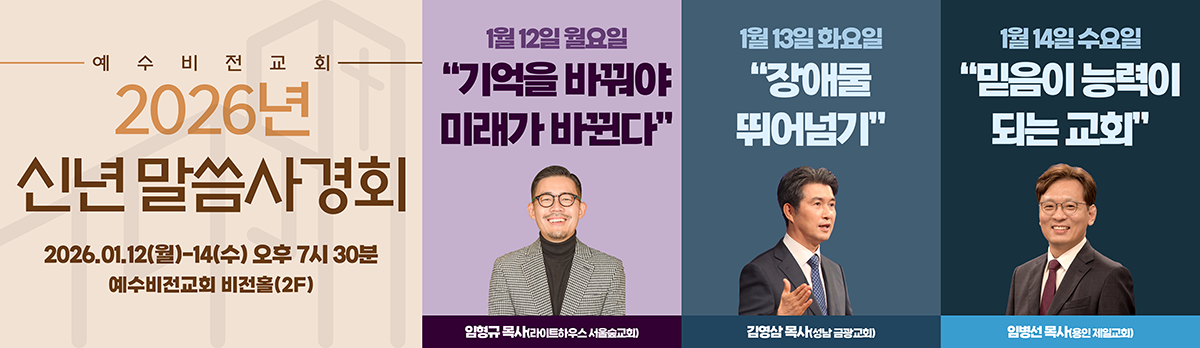 [2026년 신년 말씀사경회 셋째날] [주일설교] 하나님의 예정 (엡 1:7-14) [신앙 에세이] 누림의 축복 [쇼츠] 매일 면류관을 벗어서 주께 드려야 합니다 [1/11 찬양대] 영원한 소망 [교회노래] 꿈이 여물어 행복이 꽃피는 전주 예수비전교회 [교회 소개] 예수비전교회를 소개합니다 새로 올라온 글 매일 면류관을 벗어서 주께 드려야 합니다 여로보암의 죄 (왕상 13:33-34) 하나님의 예정(엡 1:7-14) 26. 1. 11 주보 인자한 사람(잠 19:22) 어떻게 기뻐하는 삶을 살 수 있을까? 목회 칼럼 네가 하나님이냐?예배가 위험할 수 있다아이의 손을 놓으면서 [신앙상담] 아, 그런가? 아무나 오라고 하고선, 왜 예복을 입지 않았다고 쫓아냈을까?[CTS 한국교회를 논하다] 532회ㅣ2025 WEA 서울총회악한 권세, 악한 명령에도 복종해야 하나요? 카드 묵상 내가 옳다고 생각하는 한말은 구속하는 힘이 있다신앙과 이권 최근 설교영상 여로보암의 죄 (왕상 13:33-34)하나님의 예정(엡 1:7-14)인자한 사람(잠 19:22)속은 죄 (왕상 13:11-32)찬송하는 삶(엡 1:3-6)기쁨의 소리로 (룻 4:13-17) 사진으로 보는 예수비전 교회 2026.1.11(오후예배) 2025.12.31~26.1.1(송구영신) 2025.12.28(졸업예배) 25.12.25(성탄축하예배) 로그인
