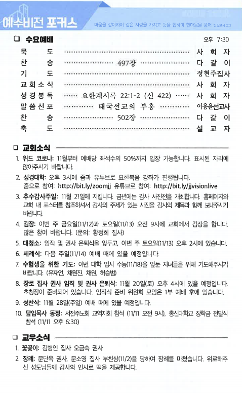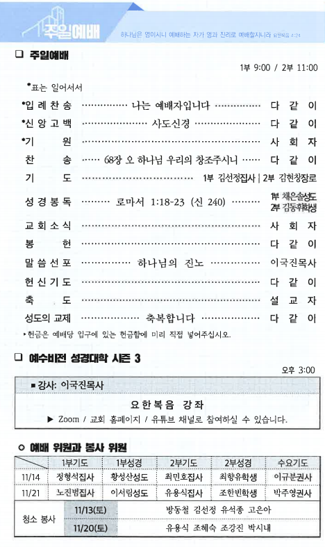 - 담임목사 동정: 서전주노회 교역자회 참석 (11/11 오전 9시), 총신대학교 장학금 전달식 참석 (11/11 오후 6:30)