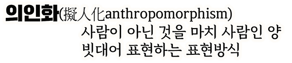 이렇게 사람이 아닌 것인데, 다시 말하자면 물건이나, 추상명사이거나, 아무튼 인격체가 아님에도 불구하고, 이러한 것들을 마치 사람인 양 표현하는 방식을 가리켜서 의인화(擬人化)라고 이야기를 합니다. 의인화라고 하는 것이 무엇일까요? 의인화라고 하는 것은 사람처럼 표현한다는 겁니다. 사람이 아닌 것을 마치 사람인 양 빗대어 표현하는 표현 방식을 가리켜서 의인화라고 말할 수가 있겠습니다. 이런 내용은 우리가 성경 해석학 시간에 다룰 내용인데, 기왕 나왔으니까, 한번 생각해 보았으면 좋겠는데요. 하나님에게도 손이 있고, 하나님의 팔이 있고, 하나님의 입이 있다고 하는 표현이 있습니다. 성경에 보면, “하나님의 손이 짧아졌느냐?” 이런 식의 표현이 있습니다. 이런 식의 표현이 있는데, 이것은 마치 하나님을 사람처럼 표현하는 것입니다. 정말 하나님도 우리들과 마찬가지로 손이 있고, 하나님도 우리처럼 발이 있고, 하나님도 우리처럼 입이 있기 때문에, 이런 표현을 하는 것이 아닙니다.