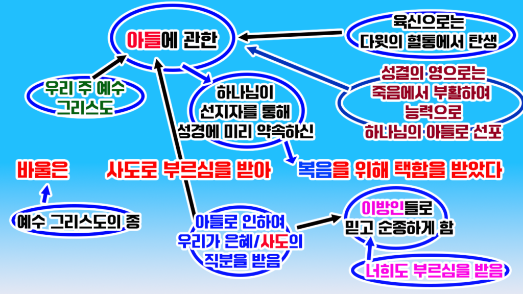 그러면 분석을 한번 해봐야 돼요. 분석을 한번 한 걸 보겠습니다. 무슨 얘기냐면, “바울은 사도로 부르심을 받았는데 복음을 위해 택함을 받았다.”라고 하는 말이에요. 그 문장을 말하기 위해서, 설명해 주고 있는 겁니다. 바울인데, 어떤 바울이냐? “예수 그리스도의 종인 바울은”이라고 이야기하고 있는 거고요. 사도로 부르심을 받아서, 복음을 위해서 택함을 받았다고 했는데, 이 복음이라고 하는 게 뭐냐? 복음이라고 하는 것은, 하나님이 선지자를 통해 성경에 미리 약속하신 것이고, 그리고 그 약속하신 그 복음이 뭐냐? 아들에 관한 게 바로 복음인 것이고, 그 아들은 누구냐? 우리 주 예수 그리스도이시고, 근데 그 우리 주 예수 그리스도 아들은 어떻게 태어났느냐? 육신으로는 다윗의 혈통에서 태어났고, 성결의 영으로는 죽음에서 부활하여 능력으로 하나님의 아들로 선포된 분이 바로 우리 주 예수 그리스도 아들이신데, 그 아들로 인해서 우리가 사도 은혜의 직분을 받은 것이고, 우리가 그렇게 사도로 직분을 받은 것은 왜 사도의 직분을 받았느냐? 이방인들로 하여금 믿고 순종하게 만들기 위해서 사도의 직분을 받은 것이고, 이방인들에게 믿고 순종하게 하려고 했는데, 바로 너희들 또 이방인들이 아니냐? 너희들도 우리들의 사도 직분에 따라서, “너희들도 부르심을 받게 되었다.”라고 하는 것이 다 줄줄이 사탕으로 매달려 있는 것인 거죠. 이해가 되십니까? 그래서 서신서를 연구할 때는 항상 종이를 펼쳐 놓으세요. 종이를 펼쳐놓고, 이 구절이 어느 구절로 연결이 되는가? 무엇을 수식해주는가? 그리고 이 구절을 통해서 무엇을 말하려고 하고 있는가? 그 핵심 요지가 무엇인가를 알지 못하면 그냥 엉뚱한 데서 헤매고 있는 겁니다. 엉뚱한 데서 그냥 단어 하나에, 그냥 표현 하나에 헤매일 뿐이지, 이 성경의 의미를 제대로 파악하기가 어려운 것입니다.