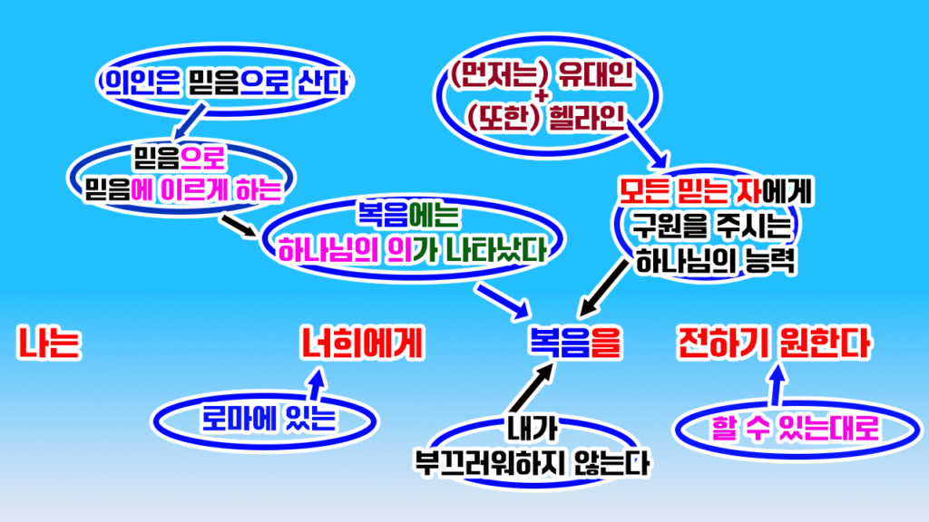마지막으로 하나 더 살펴보도록 하겠습니다. 로마서 1장 15절부터 17절까지의 말씀 이렇게 기록되어 있습니다. “그러므로 나는 할 수 있는 대로 로마에 있는 너희에게도 복음 전하기를 원하노라. 내가 복음을 부끄러워하지 아니하노니, 이 복음은 모든 믿는 자에게 구원을 주시는 하나님의 능력이 됨이라. 먼저는 유대인에게요. 그리고 헬라인에게로다. 복음에는 하나님의 의가 나타나서, 믿음으로 믿음에 이르게 하나니, 기록된 바 오직 의인은 믿음으로 말미암아 살리라 함과 같으니라.”라고 되어 있습니다. 역시 이 말씀을 우리가 한번 쭉 읽어보면, 도대체 무슨 이야기를 하려고 하고 있는지, 무슨 내용을 전달하고 있는지 명확하게 들어오지 않습니다. 하지만 종이를 꺼내놓고 분석해보면, 이렇게 분석해 볼 수가 있겠습니다.