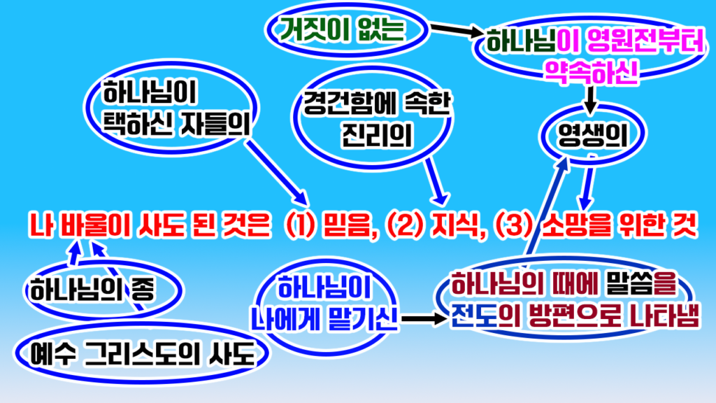 그러니까 디도서 1장 1절에서부터 3절까지 바울이 말하고자 하는 그 핵심이 뭐냐면, “내가 사도가 된 것은 믿음과 지식과 소망을 위해서 사도가 된 것입니다.”라고 하는 것을 말하기 위한 것이죠. 그리고 그 내용들을 설명해주는 그 설명들이 거기에 다 붙어서 나오고 있다. 그래서 특별히 성경 가운데서 서신서를 읽을 때에는, 이렇게 종이를 펼쳐놓고, 이게 어디에 어디에 걸려 있는지, 하나씩 하나씩 붙여보면, 이 문장의 의미를 이해할 수 있게 될 것입니다.