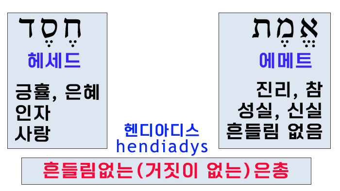 그러면 도대체 왜 “인자가 있고, 진리가 있다는 게 도대체 무슨 말인가?”라고 잘 확 마음에 와닿지 않잖아요? 이게 무엇이냐면 소위 헨디아디스(hendiadys)라고 하는 표현법입니다. 헨디아디스라고 하는 표현법인데 이것은 성경해석학에서 지나가면서 한번 간단하게 언급을 했습니다마는 <헨>이라고 하는 것은 하나고, <디아>는 통하여라고 하는 말이고, <디스>라고 하는 말은 둘입니다. 그러니까 헨디아디스를 번역하면 번역하면 무슨 뜻이 되겠습니까? 두 개를 가지고 하나의 사상을 나타내는 것을 가리켜서, 헨디아디스 용법이라고 하는 것이죠. 그러니까 지금 이 헤세드와 에메트가 헨디아디스, 두 개를 가지고 하나의 사상을 나타내기 위해서 사용된 거라고 할 수 있는 것인데, 뭐냐면 “흔들림이 없는 은총” “거짓이 없는 은총” “하나님의 흔들림이 없고 변함이 없고 참되고 신실한 하나님의 은혜와 자비”를 나타낼 때 어떻게 표현하냐면, “인자와 진리가 있느니라”라고 표현하는, 그래서 성경에서 은혜와 진리, 인자와 진리, 인자와 성실, 은혜와 성실, 은혜와 신실, 이런 표현이 나온다고 하면 어떻게 이해를 해야 해요? 하나님의 흔들림이 없는 참된 은총으로 이해를 하셔야 합니다.