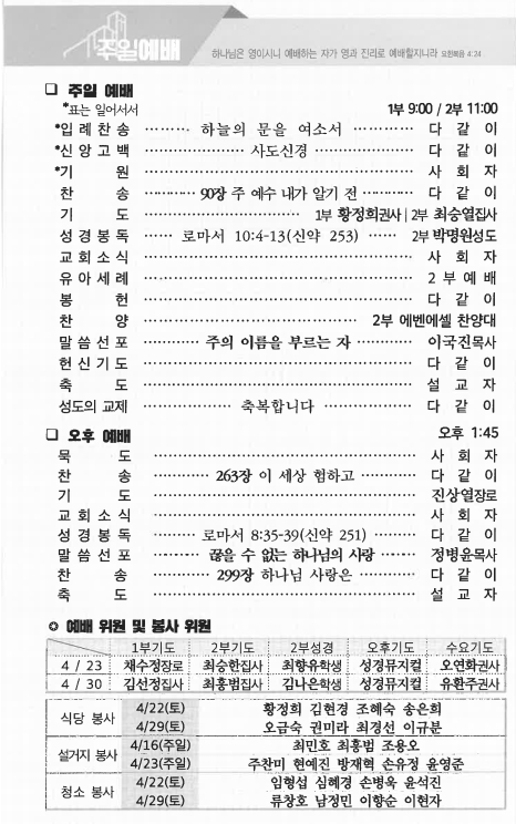 - 전도대: 이번 주 토요일(4/22) 오후 2시에 모입니다.