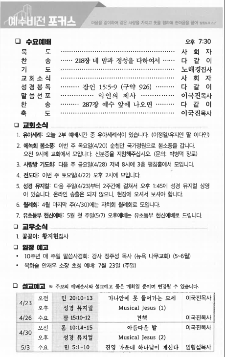 - 성경 뮤지컬: 다음 주일(4/23)부터 2주간에 걸쳐서 오후 1:45에 성경 뮤지컬 상영이 있습니다. 온라인 송출은 되지 않으니, 현장에 오셔서 보셔야 합니다.