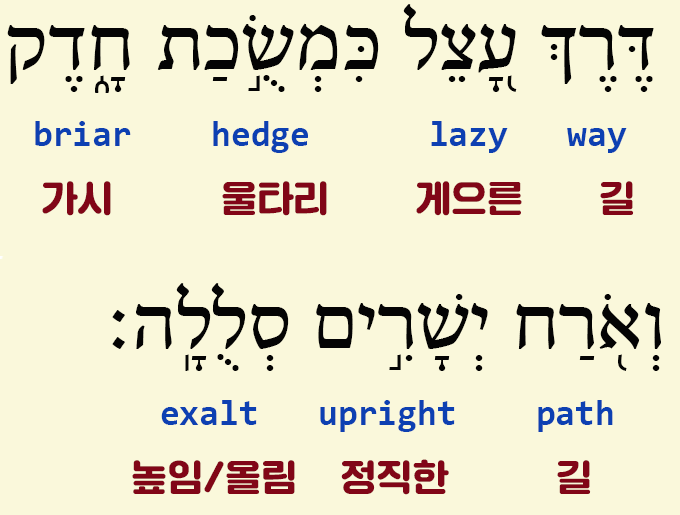 우리가 (이 히브리어 원어를 계속 한번 보여주세요.) 이 히브리어 원어를 보면, 우리 한국말 번역과는 좀 약간 다르게 되어 있는 것을 알 수가 있습니다. 앞부분은 한국말 번역이 히브리어 원어를 그대로 반영해서, “게으른 자의 길은 가시 울타리 같으나” 사실 이제, 동사가 생략되어 있는 문장이죠? “게으른 자의 길 가시 울타리”로만 되어 있습니다. 히브리어 원어는 동사가 없이. 두 번째 부분은 어떻게 되어 있는가? 한국말은 “정직한 자의 길은 대로이니라”라고 되어 있는데, 히브리어 원문은 “정직한 자의 길은, ‘길, 높음, 올림’” 이렇게 되어 있습니다. 히브리어 “슬룰라”라고 하는 단어는 맨 마지막에 있는, 맨 마지막에 있는 이 “술룰라”라고 하는 단어는 “높인다” “쌓아 올린다”라고 하는 그런 의미의 뜻이 되겠습니다.