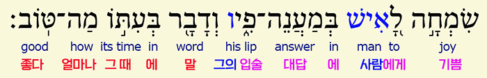 원문을 한번 살펴보면 좋을 것 같습니다. 원문을 보니까 이렇게 되어 있습니다. “그의 입술의 대답으로 사람에게 기쁨이 있고, 때에 맞는 말이 얼마나 좋은가”라고 하는 그런 의미입니다. 이렇게 히브리어 원어의 그 표현을 가만히 보면, 좀 동사가 잘 안 보이죠? 하지만 충분히 어떤 동사의 의미가 있는지 우리가 넣어서 이해할 수 있을 것입니다. “그의 입술의 대답으로 사람에게 기쁨이 생기고, 그리고 그 때에 맞는 말이 얼마나 좋은가”라고 하는 그런 의미인데, 그의 입술이라고 했을 때, 그의 입술은 누구의 입술이겠습니까? 사람의 입술이겠죠. 그러니까 사람이 그 입술로 대답을 하는 것이 사람에게 기쁨이 된다고 하는 것이니까, 원문으로 보면, 누가 기쁨을 갖는 것인가? 아마도 대답하는 사람이 기쁨을 가지게 되는 것이라고 볼 수도 있겠고요. 그러나 여기서 사람이라고 하는 단어는 어떤 특정한 사람을 지칭하는 것이 아니라, 어떤 특정인을 가리키는 것이 아니라, 일반적인 그런 개념으로서의 사람을 말하는 것이니까, 그냥 듣는 사람이든 말하는 사람이든 어떤 사람이든 기쁨을 가지게 된다고 하는 그런 의미로 이해할 수 있겠습니다. 그러니까 대답을 하게 되면, 그 대답하는 것을 들은 그 사람이 기쁨을 가지게 되는 것이고, 또 그 대답을 들은 사람만 기쁨을 갖게 되는 것이 아니라, 그 대답을 한 사람도 기쁨을 가지게 될 거라고 하는 것으로 이해하셔도 될 것 같습니다.