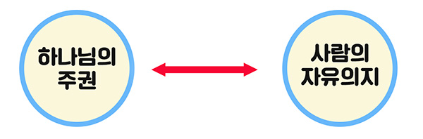 하지만 그러한 생각은 결코 성경적인 생각이 아닙니다. 졸고 계시다가, 제가 아까 한 얘기만 듣고, 그렇게 오해하시면 안 됩니다. 정신 바짝 들리고 들으셔야 되는 거예요. 정신 바짝 차리고 들으셔야 돼요. 그런 식으로 신앙생활하면 안 되는 거예요. 우리가 행하는 것과 하나님께서 행하시는 것 사이에 충돌이 있는 것이 아닌 것이죠. 우리가 신앙생활하면서 가장 기본적으로 알아야 될 것이 있다고 한다면 하나님의 주권과 우리 인간의 자유 의지가 서로 충돌되지 않는다고 하는 사실입니다. (그림을 보여주세요.) 하나님의 주권 하나님께서 온 세상을 통치하시고 다스리시고, 하나님께서 모든 것을 다 하나님의 뜻대로 이루어 나가시는 것을 가리켜서 “하나님의 주권”이라고 말하는데요. 그것에 반해서 “사람의 자유 의지”라고 하는 것은 우리가 자유로운 그런 선택을 하고, 자유로운 그런 의지를 가지고, 우리의 뜻대로 마음대로 하는 것을 가리켜서, “사람의 자유 의지”라고 말할 수 있겠는데, 이 둘 사이가 서로 충돌해 버리는 것이 아니라, 사실은 충돌하지 않는다고 하는 것이 성경의 기본적인 가르침입니다. 다시 말하지만 하나님께서 우리를 구원해 주시는데, 우리가 거부하고 믿지 않고 악을 계속 행하고 있음에도 불구하고, 하나님께서 우리를 구원하시는 법이 없는 것이고, 하나님께서 선택하지 아니하셨는데, 우리가 믿음을 가지고서 구원을 받는, 그런 그렇게 충돌되는 일이 일어나는 것이 아니라, 사실은 이 둘이 같이 간다고 하는 사실을 우리가 기억해야 할 것입니다.