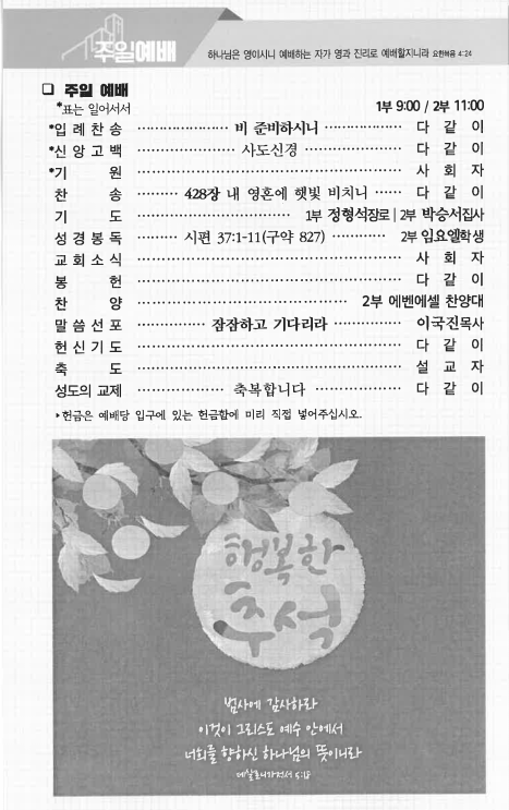 (1) 오늘은 민족의 명절 추석이므로, 오전예배(1부, 2부)만 드리고, 오후 집회는 따로 모이지 않습니다.