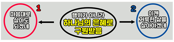 두 가지 가능성이 우리들에게 있을 것이라고 생각을 합니다. 한번 도표를 봤으면 좋겠는데요. 우리의 구원이 무엇인가? 우리가 구원받는 것은 행위에 의해서 구원받는 것이 아니고, 하나님의 은혜로 구원받는 것이 확실하다고 한다면, 그럼 어떤 결론이 나올 것인가? 두 가지 결론이 나올 수 있을 것입니다. 첫 번째 결론이 있다고 한다면, “그래? 그러면 그냥 마음대로 아무렇게나 살아도 괜찮겠네”라고 하는 결론이 나올 수 있습니다. (예, 지워주십시오.) 우리가 열심히 착하게 살아야 구원을 얻는다고 한다면, 열심히 착하게 살아야죠. 우리가 무엇인가 완벽해야만 구원을 얻는다고 한다면, 완벽해지기 위해서 노력하게 될 것입니다. 하지만 우리의 구원이 그러한 것에 달려 있는 것이 아니라, 하나님께서 누구든지 은혜로 구원을 베풀어주시는 것이라고 한다면, 많은 사람들이 어떤 생각을 하냐면, “그래? 그러면 내가 굳이 그렇게 열심히 살 필요 없겠네. 굳이 하나님의 말씀 지키면서 살지 않아도 되겠네. 마음대로 살아도 되겠네.”라고 하는 그런 결론을 내리기가 쉽습니다.