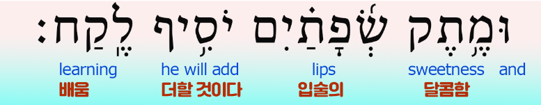 (여기에 대해서도 원어가 있나요? 봅시다.) 그런데 입이 선하다고 하는 말이 무슨 말일까요? 입이 선하다. 원문에 보니까, 이렇게 나와 있어요. 입술의 달콤함이 배움을 더할 것이다. 더한다고 하는 말이 “요셉”이에요. 요셉. 요셉이라고 하는 아들의 이름이 “더하다”라는 뜻이잖아요? 요셉이라고 하는 말이 나왔어요. 입술의 달콤함이 배움을 더하게 할 것이다. 한국말 성경에는 선한 입술이라고 번역을 했는데, 히브리어 원문은 “입술에 달콤함이 있으면 다른 사람들로 하여금 배움을 가지게 만들어줄 거다”라고 하는 그런 의미입니다. 이 말씀의 의미가 무엇이죠? 말을 할 때 어떻게 말을 해야 된다는 얘기예요? 달짝지근하게 얘기하라 이 말이에요. 달짝지근하게 말을 들으면 행복하게 느껴지도록 얘기하란 말이에요. 아 듣고 싶어. 단 거 자꾸 먹고 싶듯이, 누군가에게 하면, 그 말을 듣고 싶고, 그 사람하고는 더 이야기하고 싶고, 더 그 사람하고 말하고 싶고 하게, 그런 지혜롭게 말의 달콤함을 가지고 이야기를 하라. 이 말이에요.