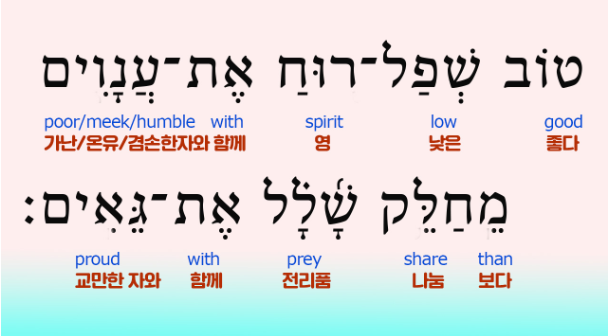 계속해서 잠언서 16장 19절의 말씀은 이렇게 기록합니다. “겸손한 자와 함께하여 마음을 낮추는 것이 교만한 자와 함께하여 탈취물을 나누는 것보다 나으니라. 겸손한 자와 함께해서 마음을 낮추는 게, 교만한 자와 함께해서 탈추물을 나누는 것보다 낫다고 말씀해 주셨는데, 이 대비가 조금 약간 애매해 보입니다. 그래서 “원문을 한번 살펴보았으면 좋겠다” 생각해서, 원문을 살펴보았는데요.