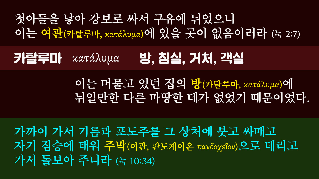 여관이라고 하는 헬라어 단어는 따로 있습니다. “판도케이온”이라고 하는 단어가 여관이라고 하는 그런 단어인데요. 선한 사마리아인에 비유해 보면, 사마리아인이 강도 만난 사람에게 가까이 가서, 기름과 포도주를 그 상처에 붓고 싸매고, 자기 짐승에 태워서 여관으로 데리고 가서 거기서 돌보아 주었다고 하는 이야기가 기록되어 있는데요. 여관은 그런 “판도케이온”이라고 하는 단어가 여관이고, 카탈루마라고 하는 것은 방을 의미하는 겁니다. 객실을 의미하는 것이죠. 따라서 누가복음 2장 7절의 말씀은 여관에서 잠자리를 찾을 수 없었던 것이 아니라, 아기를 낳았는데, 아기를 놓을 만한 방 안에 마땅한 장소가 적절치 않아서, 가장 좋아 보이는 곳 여물통 속에 넣어두었다고 하는, 그런 의미로 이해하는 것이 옳을 것 같습니다.