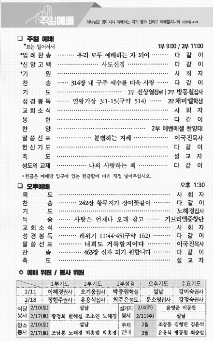 - 설날 연휴안내: 설날 연휴로 인하여 (1) 새벽기도회는 이번 주의 경우 목요일(2/8)까지 교회에서 드리며, 금요일(2/9)은 개인 기도의 시간으로 대치됩니다. (2) 다음 주일(2/11)은 오전 예배만 드리며, 점심 식사는 준비되지 않습니다. (3) 설날 가정예배를 위한 자료가 필요하신 분은 자료가 준비되어 있으니 활용하시기 바랍니다.