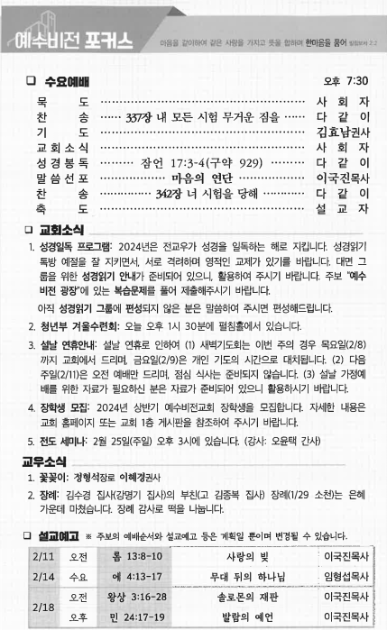 - 성경일독 프로그램: 2024년은 전교우가 성경을 일독하는 해로 지킵니다. 성경읽기 톡방 예절을 잘 지키면서, 서로 격려하며 영적인 교제가 있기를 바랍니다. 대면 그룹을 위한 성경읽기 안내가 준비되어 있으니, 활용하여 주시기 바랍니다. 주보 “예수비전 광장”에 있는 복습문제를 풀어 제출해주시기 바랍니다. 아직 성경읽기 그룹에 편성되지 않은 분은 말씀하여 주시면 편성해드립니다.