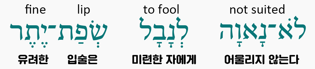 그렇게 고민을 하면서, 과연 원문에는 어떻게 되어 있을까? 한번 살펴보았습니다. 그랬더니 원문에는 다르게 표현이 되어 있습니다. 원문을 한번 봤으면 좋겠는데요. 원문은 앞부분이 이렇게 되어 있습니다. “유려한 입술은 미련한 자에게 어울리지 않는다”라고 하는 말로 앞부분이 되어 있습니다. 그러니까 우리 한국말 성경에서 잠언서 17장 7절에서 “지나친 말”이라고 표현한 것이, 원문을 보니까, 지나친 말이 아니라, 유려한 입술이라고 하는 말로 되어 있는 것이죠. 미련한 자에게 어울리지 않는 것, 미련한 자에게 합당하지 않는 것이 지나친 말이 합당하지 않은 것이 아니라, “유려한 말” “멋진 말” “뛰어난 말”이 미련한 자에게는 어울리지 않는다고 하는 그런, 그런 것으로 성경 원문에 그렇게 되어 있는 것을 확인할 수가 있었습니다.
