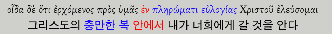 그리스도의 충만한 복을 “가지고”가 아니라, “그리스도의 충만한 복 ‘안에서’ 내가 너희에게 갈 것을 안다”라고 되어 있었어요. 그러니까 이 말씀은, 바울 사도가 한 말씀은, 하나님께서 내게 충만한 복을 주셨는데, 그 복을 가지고 가서, 내가 너희들에게 나누어 주겠다고 말한 것이 아닌 겁니다. 이 표현의 의미는 무엇이냐 하면, 바울 사도가 로마 교회를 방문하게 될 때, 그 만남이 복된 만남이 될 거라고 하는 거예요. 내가 로마 교회 성도들과 함께 만나서, 거기서 영적인 교제를 나누게 될 텐데, 그 교를 나누는 것이, “그리스도 안에서” 그리스도 예수의 충만한 복 안에서 만나는, 그 만남이 될 거라고 하는 것을 이야기한 것이죠.