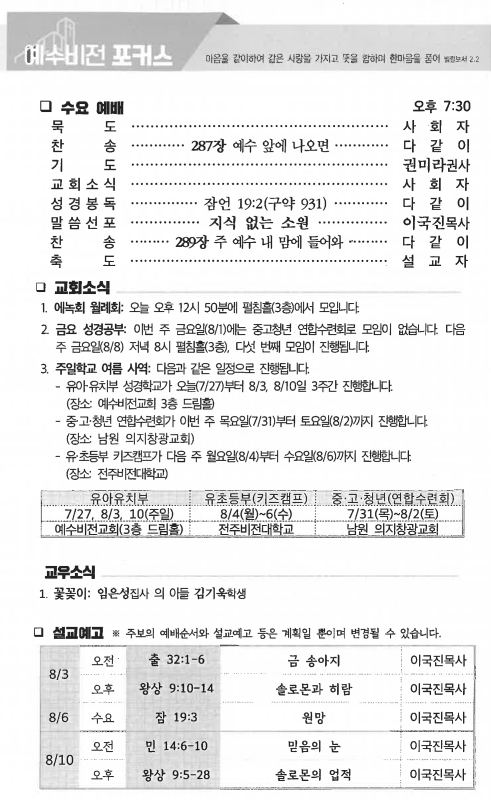 - 금요 성경공부: 이번 주 금요일(8/1)에는 중고청년 연합수련회로 모임이 없습니다. 다음 주 금요일(8/8) 저녁 8시 펼침홀(3층), 다섯 번째 모임이 진행됩니다.