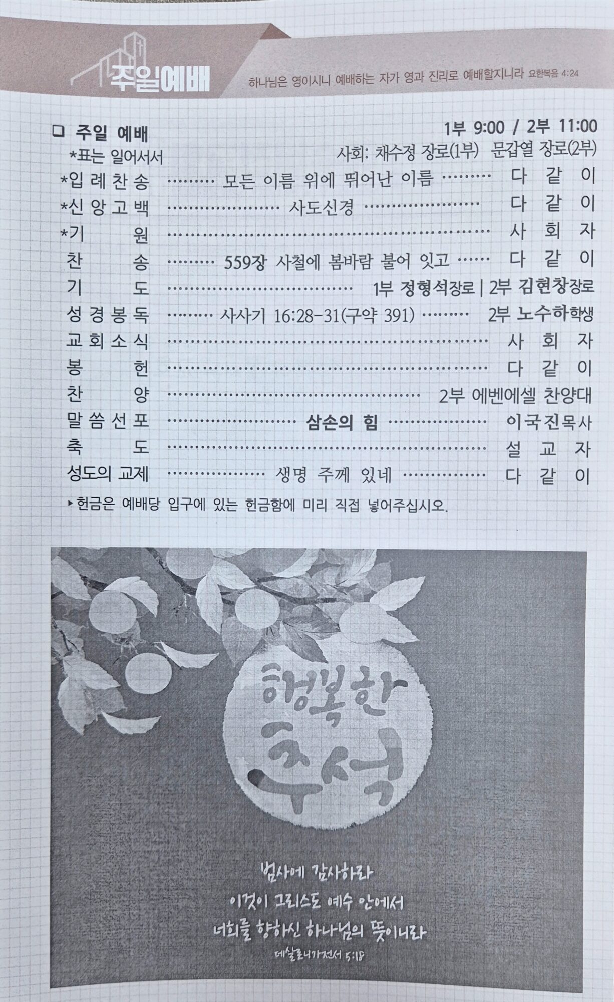 - 추석 연휴기간 예배안내: 오늘 예배는 오전예배(1부, 2부)만 드리고, 주일 오후예배와 주중 예배는 모이지 않습니다. 연휴 기간 동안에도 성경읽기는 계속됩니다. 새벽 기도회는 다음 주 월요일(10/13) 부터 재개됩니다.