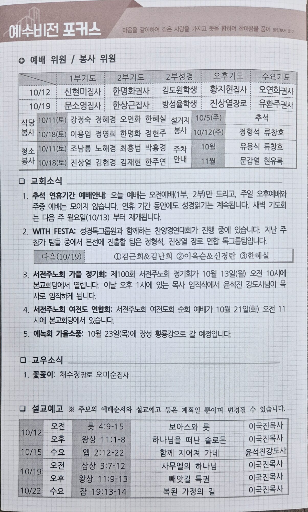 다음(10/19) ①김근희&김난희 ②이옥순&신경란 ③한혜실 - 서전주노회 가을 정기회: 제100회 서전주노회 정기회가 10월 13일(월) 오전 10시에 본교회당에서 열립니다. 이날 오후 1시에 있는 목사 임직식에서 윤석진 강도사님이 목사로 임직하게 됩니다.