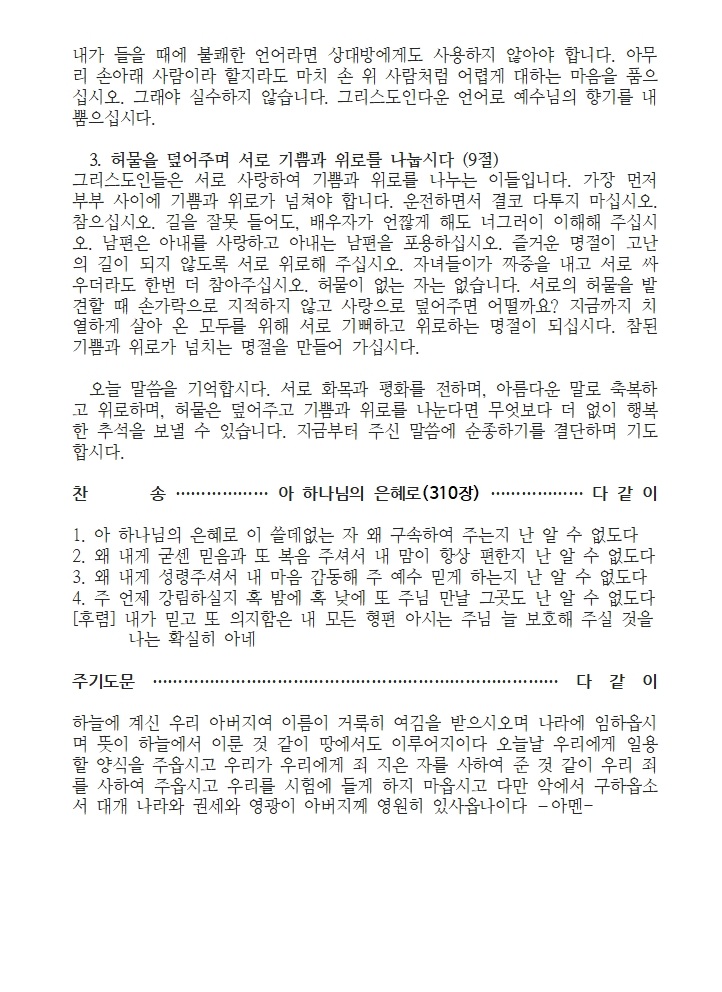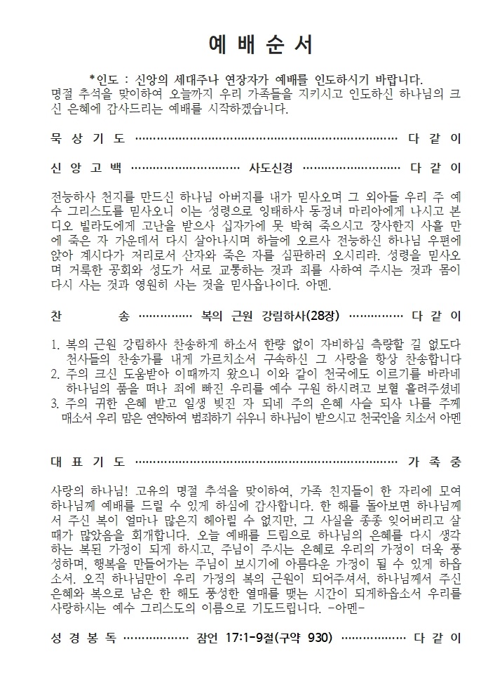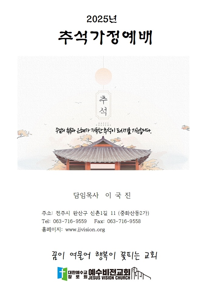 추석 가정예배 순서지 2025 skyo2345 2025-10-04 행사 안내 0 댓글 2025년 추석 명절 예배순서지다운로드 글 내비게이션 Previous Previous post: 25. 10. 5 주보Next Next post: 삼손의 힘 (삿 16:28-31) 답글 남기기 응답 취소이메일 주소는 공개되지 않습니다. 필수 필드는 *로 표시됩니다댓글 * 이름 * 이메일 * 웹사이트 다음 번 댓글 작성을 위해 이 브라우저에 이름, 이메일, 그리고 웹사이트를 저장합니다. Current ye@r * Leave this field empty