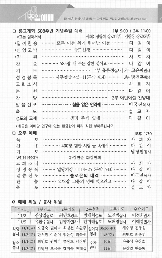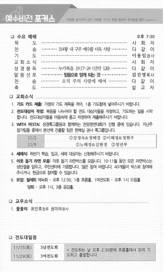 11/2 ①노해경&김현경 ②청년부 - 세례식: 하반기 학습, 입교, 세례 대상자는 신청해주시기 바랍니다.