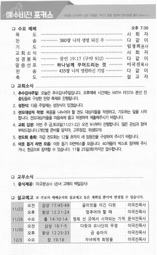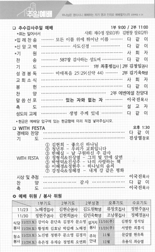 - 추수감사주일: 오늘은 추수감사주일입니다. 오후예배 시간에는 WITH FESTA 본선 진출팀들로 구성한 찬양 축제로 진행됩니다.