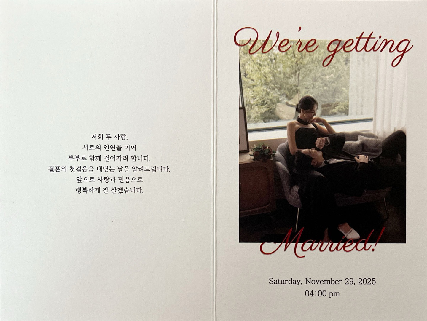 최석준 김나예 성도 결혼식(11/29) admin 2025-11-22 애경사 0 댓글 일시: 2025년 11월 29일 토요일 오후 4시 장소: 제주정원 글 내비게이션 Previous Previous post: 하나님께 꾸어드리는 것 (잠 19:17)Next Next post: 25. 11. 23 주보 답글 남기기 응답 취소이메일 주소는 공개되지 않습니다. 필수 필드는 *로 표시됩니다댓글 * 이름 * 이메일 * 웹사이트 다음 번 댓글 작성을 위해 이 브라우저에 이름, 이메일, 그리고 웹사이트를 저장합니다. Current ye@r * Leave this field empty