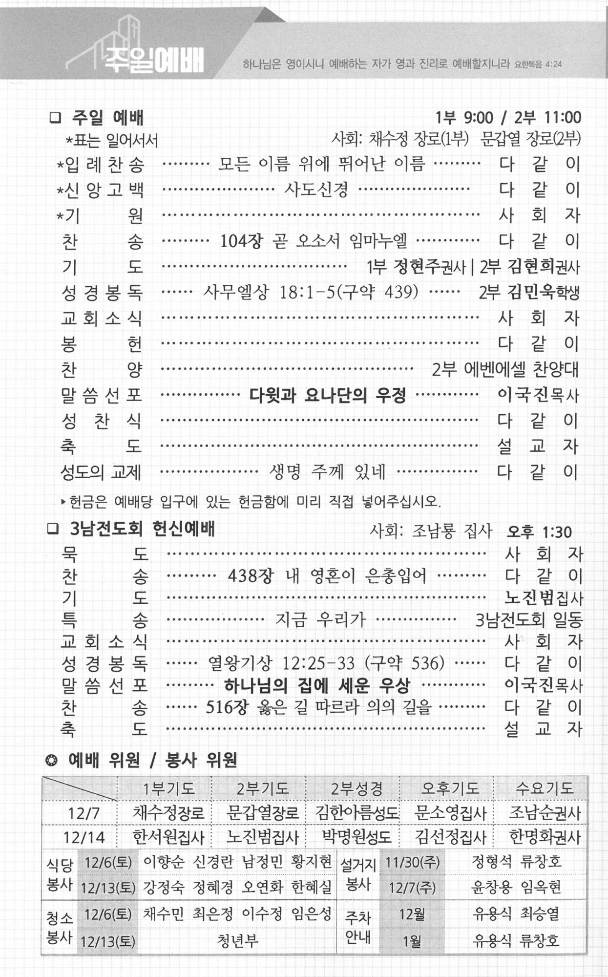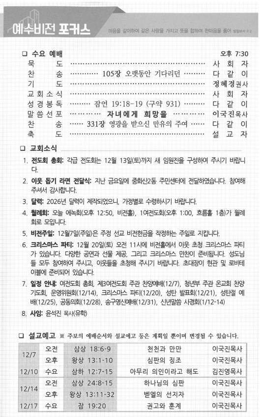 - 비전주일: 12월7일(주일)은 주정 선교 비전헌금을 작정하는 주일로 지킵니다.