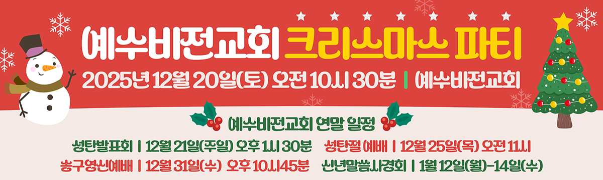 크리스마스 파티 admin 2025-12-17 행사 안내 0 댓글 글 내비게이션 Previous Previous post: 2026 신년 말씀 사경회Next Next post: 권고와 훈계 (잠 19:20) 답글 남기기 응답 취소이메일 주소는 공개되지 않습니다. 필수 필드는 *로 표시됩니다댓글 * 이름 * 이메일 * 웹사이트 다음 번 댓글 작성을 위해 이 브라우저에 이름, 이메일, 그리고 웹사이트를 저장합니다. Current ye@r * Leave this field empty