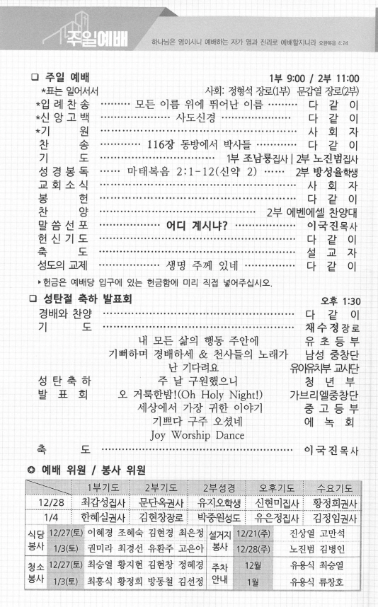 - 월례회: 다음 주일(12/28) 에녹회(오후 12:50, 비전홀)가 월례회로 모입니다.