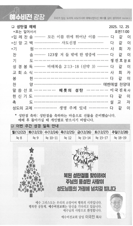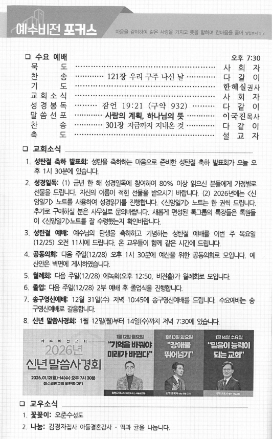 (2) 2026년에는 <신앙일기> 노트를 사용하여 성경읽기를 진행합니다. <신앙일기> 노트는 한 권씩 드립니다. 추가로 구매하실 분은 사무실로 문의바랍니다. 새롭게 편성된 톡그룹의 톡장들은 톡원들이 <신앙일기>노트를 잘 수령했는지 확인바랍니다. - 성탄절 예배: 예수님의 탄생을 축하하고 기념하는 성탄절 예배를 이번 주 목요일(12/25) 오전 11시에 드립니다. 온 교우들이 함께 같은 시간에 드립니다.