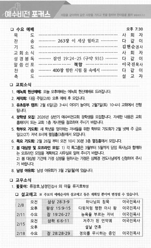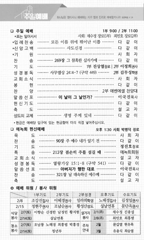 - 제직회: 다음 주일(2/8) 오후 예배 후 모입니다.