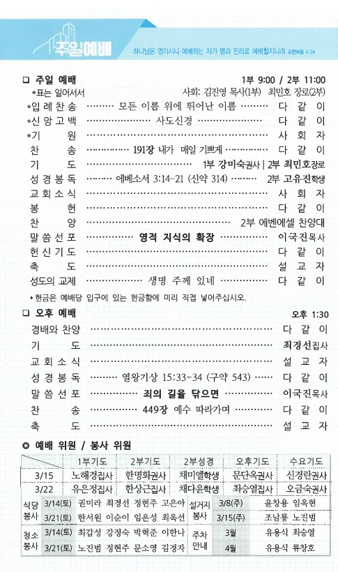 입교, 세례식: 3월 22일 주일에 있을 예정입니다. 학습 세례 입교를 원하시는 분은 신청하여 주시기 바랍니다.