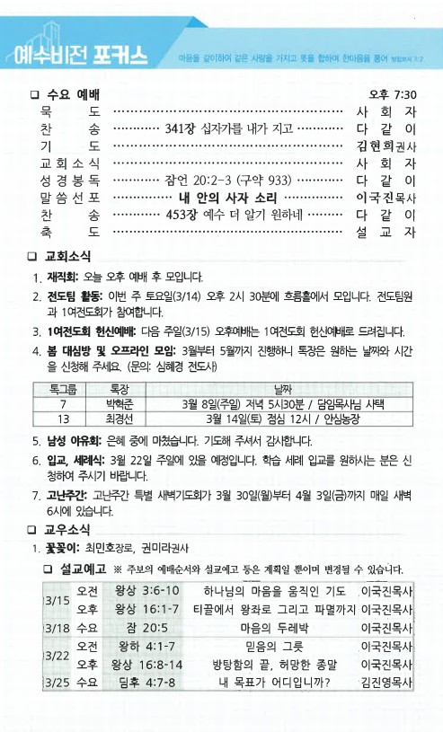 고난주간: 고난주간 특별 새벽기도회가 3월 30일(월)부터 4월 3일(금)까지 매일 새벽 6시에 있습니다.