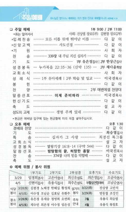 부활절: 4월 첫째 주일(4/5)은 부활절입니다. 전주시 기독교연합회 주최 부활절 연합예배는 오후 3시에 순복음참사랑교회에서 열립니다.