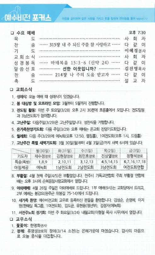 월례회: 다음 주(3/29)에 에녹회(오후 12:50, 펼침홀), 1여전도회(오후 1시, 드림홀)