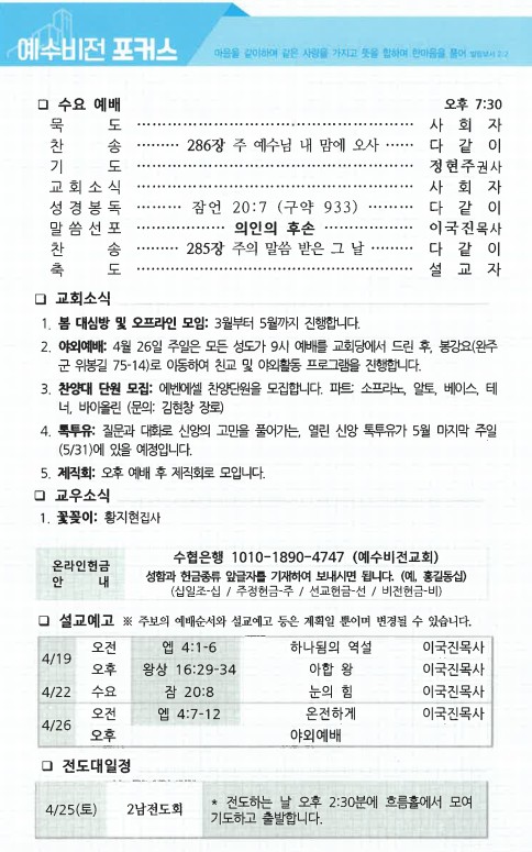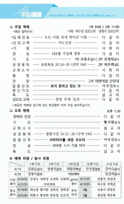 야외예배: 4월 26일 주일은 모든 성도가 9시 예배를 교회당에서 드린 후,
