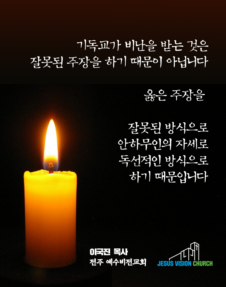 기독교가 비난을 받는 것은 admin 2020-06-12 카드 묵상 0 댓글 사족: 기독교가 비난을 받는 이유가 “오직” 무례함 때문이라고 주장하는 말은 아니구요. 수많은 이유가 있겠지만, “무례함”의 문제도 좀 생각하자는 말입니다. Tagged 독선, 표현 글 내비게이션 Previous Previous post: 당신의 말이 불쾌하다고 말하면Next Next post: 만만치 않은 세상에서 살아가는 것이 힘듭니다 답글 남기기 응답 취소이메일 주소는 공개되지 않습니다. 필수 필드는 *로 표시됩니다댓글 * 이름 * 이메일 * 웹사이트 다음 번 댓글 작성을 위해 이 브라우저에 이름, 이메일, 그리고 웹사이트를 저장합니다. Current ye@r * Leave this field empty