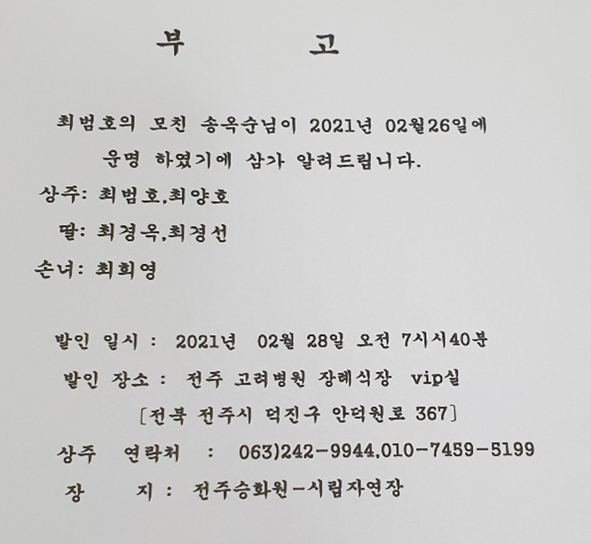 오연숙 권사 시모상 admin 2021-02-26 행사 안내 0 댓글 개별적으로 문상바랍니다. 2월 26일(금) 오후 5시에 문상을 하실 분은 오십시오. Tagged 오연숙, 장례 글 내비게이션 Previous Previous post: 나를 기뻐하시므로 (삼하 22:8-20)Next Next post: 직분자 선출 일정 안내 답글 남기기 응답 취소이메일 주소는 공개되지 않습니다. 필수 필드는 *로 표시됩니다댓글 * 이름 * 이메일 * 웹사이트 다음 번 댓글 작성을 위해 이 브라우저에 이름, 이메일, 그리고 웹사이트를 저장합니다. Current ye@r * Leave this field empty